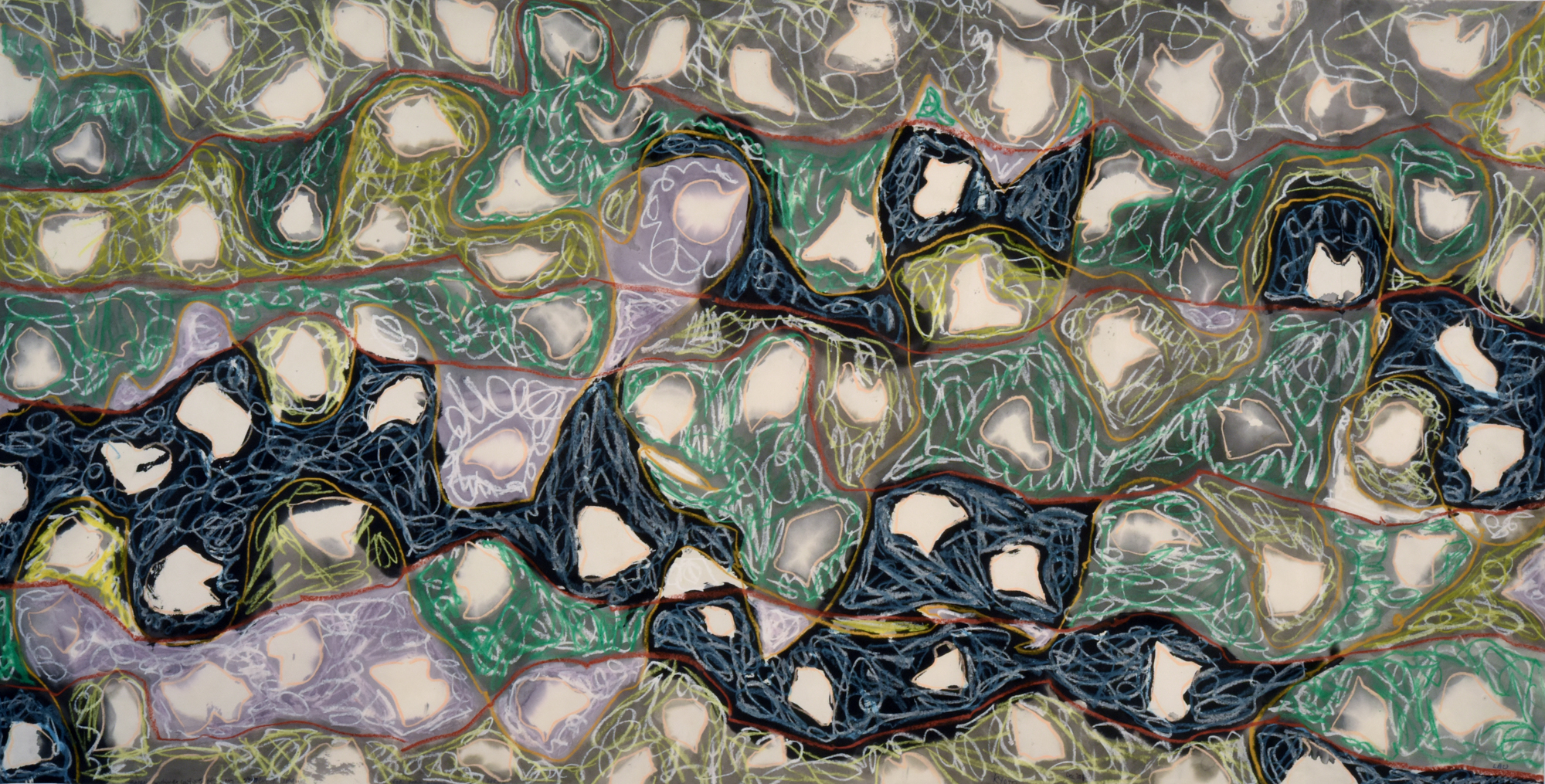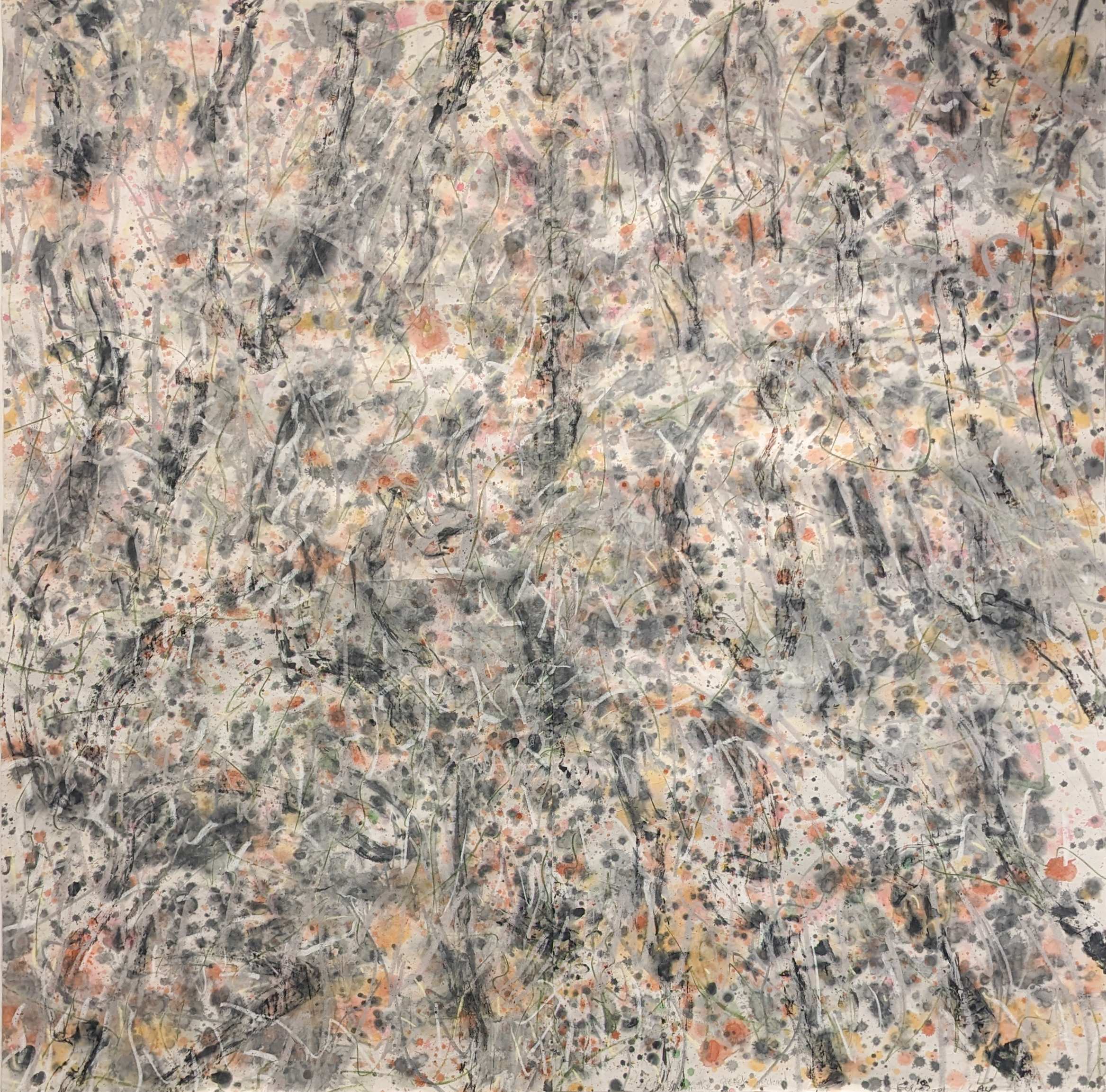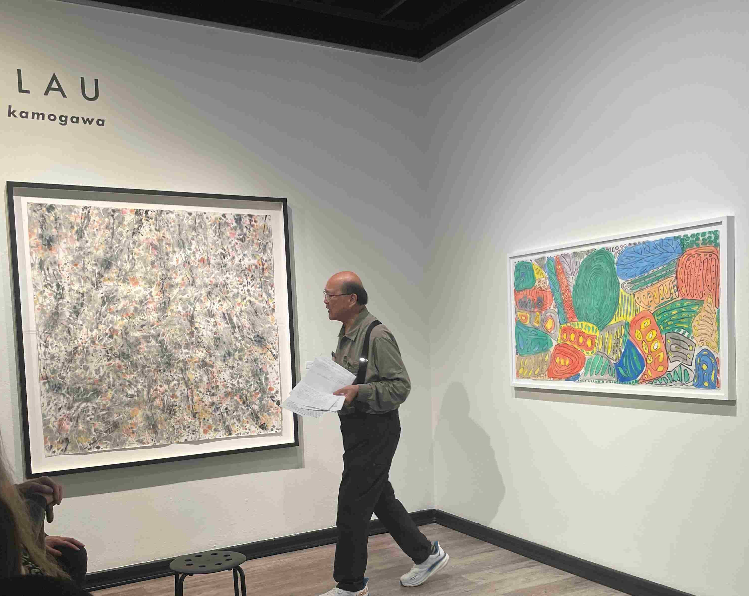Alan Lau  focuses on nature intimately.`“Walks Along the Kamogawa: The Kyoto Series Part I” gives us lyrical paintings in sumi, watercolor and pastel on rice paper that evoke hanging vines and swirling waters, sometimes birds (tracing migration patterns of small birds) and animals (when the zebra lost her spots).