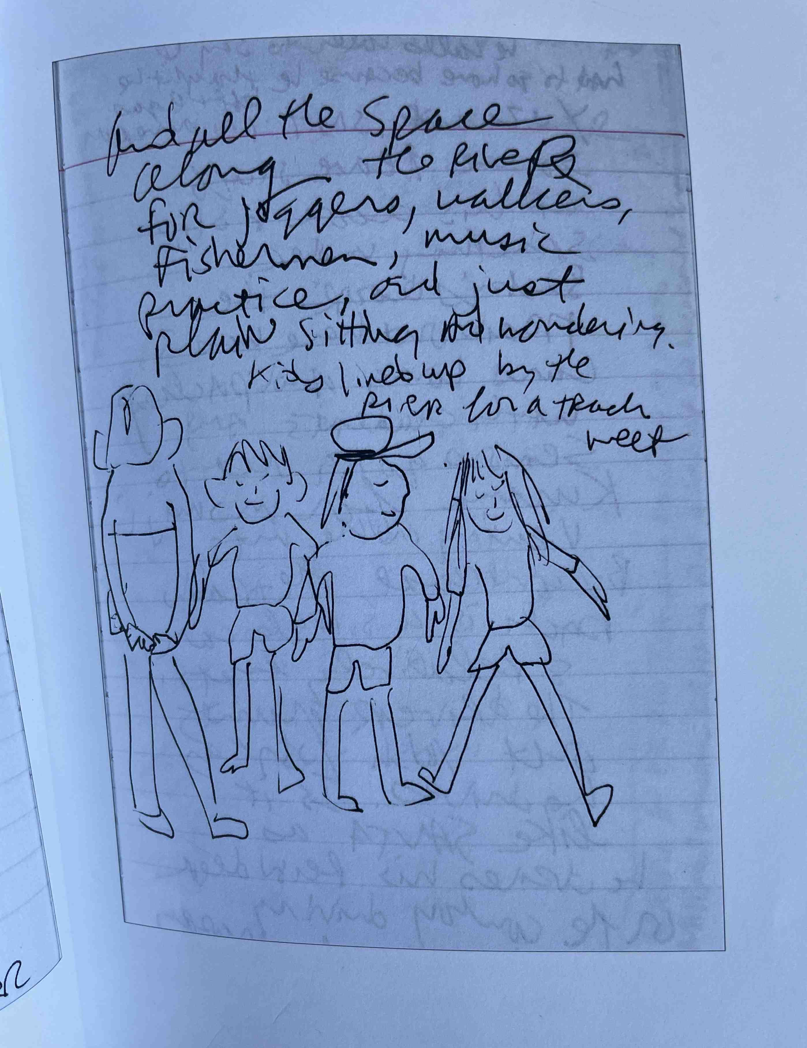 That quote is from his recent book This Single Road. The book is an experimenatl format, with drawings, writing in script and  printed narrative, making it into a collage. The book includes his observations along the Kawagama river : along the sidewalks beside it he sees  a playground, musicians, seniors doing aerobics , and children in a race. The minuteness of his observations really affected me. I started  doing the same thing,looking at a space with careful observations.