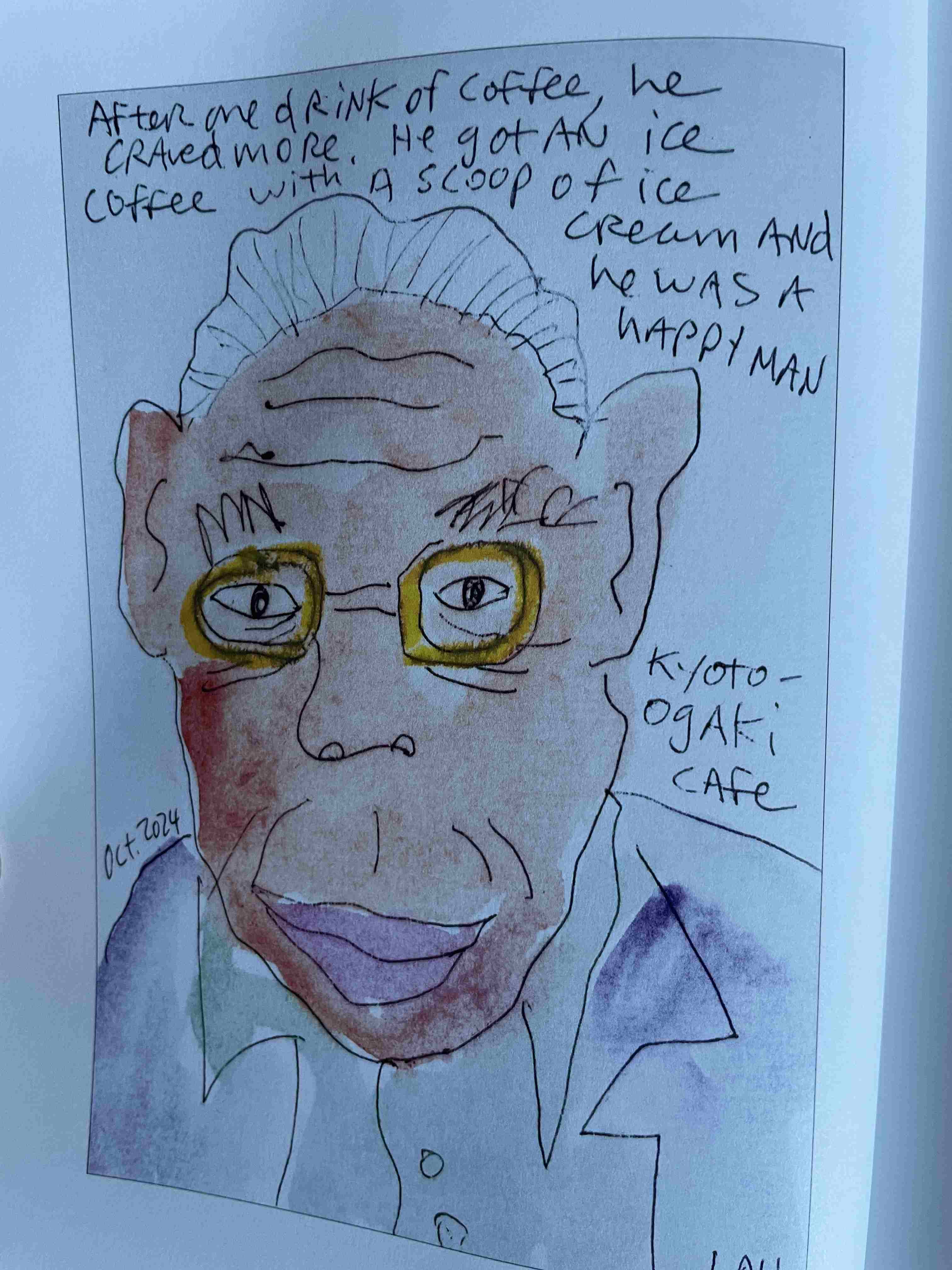We can imagine the artist in Kyoto in his “make shift studio in my in-laws’ house…the only room in the house where the sun filters in. Below I see the tiny garden with a lone persimmon tree with orange bursts of fruit and a spindly Japanese tree blushing with red and yellow leaves.”