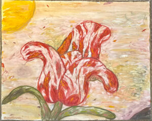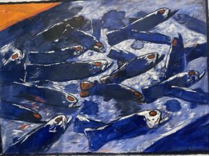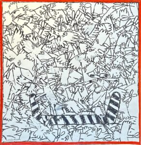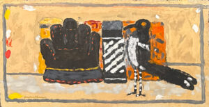 There is one painting with Gaylen’s alter ego Kernal, the only black and white work. A swarm of ducks fill the sky behind the Kernal who is paddling a striped canoe with a dog in the bow. Fish leap up for the birds across the bottom of the painting.