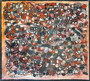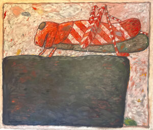 As we enter the gallery we see a swarm of bright blue fish with intense red eyes, mouths open and teeth bared. Turning to the right we see a red wall with irregular bricks and large grasshoppers climbing on it. But the painting is titled “Red Wall Two Ducks.” I asked the gallery owner where the ducks were and he said, “Behind the wall.” Hansen’s sense of humor!