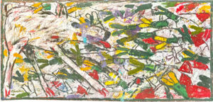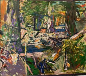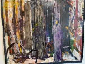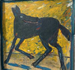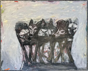 He moved to Whidbey Island in 2014. It was a radical change of environment. The Palouse is a wide-open horizontal landscape while Whidbey Island is filled with tall closely packed trees. A loosely painted image of a bear in the forest from 2021, suggests that bears are still running through his life, but now they are taking second place to the forest.