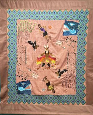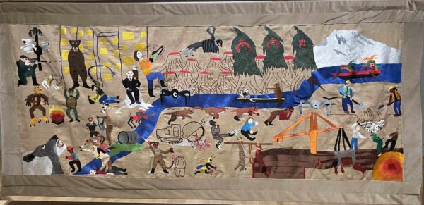A second embroidery facing the other way is titled our “skies were once filled with stars.” It shows the deterioration of the environment. All is chaos, fear and conflict. A white man in the foreground stands on a pile of bones.