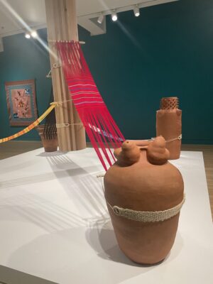 In the center of the exhibition an installation large ceramic vessels suggest women’s  torsos. “The four winds gathered around Tree and her threads.” They contain whistles and are connected by backstrap weaving, a long tradition in Mayan culture, to a “tree” representing the Mayan tree of life.