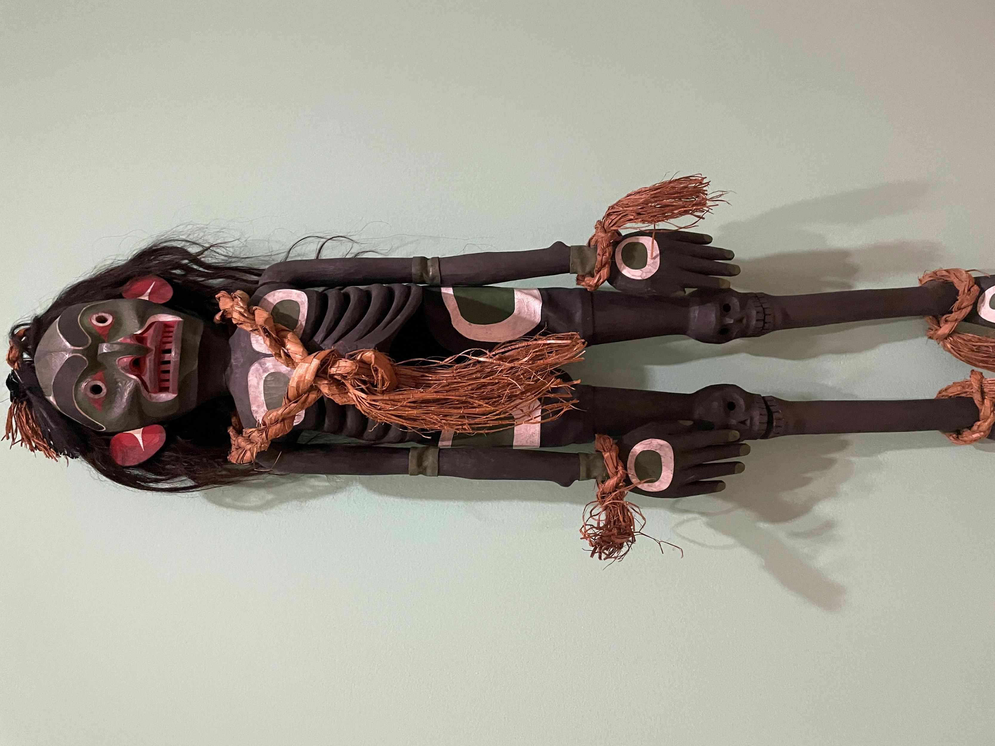 “Winalagalis The War Spirit Puppet” creates trouble wherever he goes. In the exhibition there were several examples of this disruptive spirit. Under the theme of Hamat’sa we  saw Moogums four masks representing the “bird henchman” of the cannibalistic giant. Another group are the ghosts who seem to be taking care of the giant and they can resurrect people from  the dead. Apparently there is also a reference to Dickens’ Christmas Carol ghosts! The layers of meaning and materials are complex and can only be touched on here.